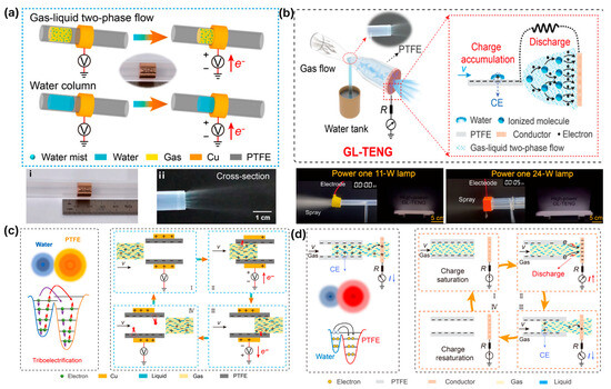 Comparison of indirect and direct charge transfer mechanisms in GL-TENGs: (a,c) Indirect mechanism with electrostatic induction via gas–liquid flow in a PTFE tube [50]. Copyright 2024, Elsevier. (b,d) Direct mechanism enabling charge transfer through direct contact with electrodes [51]. Copyright 2022, Science Advances.