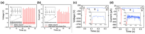 Comparison of electrical performance between indirect and direct charge transfer mechanisms in GL-TENGs. (a,b) Peak voltage and current output of RSE-TENG based on gas-liquid two-phase flow (in red), which is much higher than the control group based on water column (in black) [50]. Copyright 2024, Elsevier. (c) Voltage, and (d) Generated current, from the GL-TENG. Copyright 2022, [51] Science Advances.