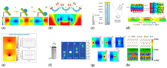 Comparison of indirect and direct charge transfer mechanisms in GL-TENGs: (a) Charge and potential changes in liquid and gas flow sensors [60]. Copyright 2021, ACS Nano. (b) The U-tube TENG’s structure, material surface, charge movement, and potential distribution during operation [61]. Copyright 2023, Micromachines. (c) The schematic setup for detecting two-phase CBM flow using a sensor in a water-filled pipeline with air bubbles [62]. Copyright 2020, Nanotechnology. (d) Working mechanism of the DT-TENG [35]. Copyright 2020, Advanced Energy and Sustainability Research. (e) Simulations of fluid dynamics and electric field distribution for FB-TENGs [58]. Copyright 2024, Advanced Materials. (f) Simulation of the electric field during droplet’s movement in the L–L TENG [46]. Copyright 2022, Advanced Functional Materials. (g) Simulations of electric field distribution for LLi-TENGs [46]. Copyright 2020, Nano Energy. (h) Simulation of solid–liquid charge transfer based on density functional theory (DFT) [51]. Copyright 2022, Science advances.