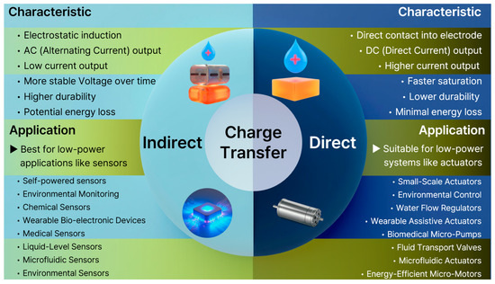 In this review, we systematically categorize and compare the mechanisms of direct and indirect charge transfer in TENGs, focusing on their distinct pathways for energy generation and their impact on device performance. While individual studies have implicitly touched upon these concepts for specific devices, a comprehensive review that systematizes this direct vs. indirect dichotomy into a unified framework for all major fluid-based interfaces (Solid–Liquid, Liquid–Liquid, and Gas–Liquid) has been notably absent. Our work addresses this gap by establishing this classification as a fundamental design principle. Drawing from extensive studies involving over 40,000 related triboelectric studies of diverse interfaces, we highlight how charge accumulation on dielectric surfaces influences interactions with electrodes and energy conversion processes [17,18]. Indirect charge transfer occurs when a dielectric surface interacts with another material and becomes charged, with an electrode placed behind the surface enabling triboelectricity generation through electrostatic induction [19]. In this process, the accumulated charges create a potential difference, driving electron flow indirectly between the materials involved. Conversely, direct charge transfer occurs when a charged object moves across or comes into direct contact with a dielectric surface, enabling the accumulated charges to flow directly to an electrode without any intermediate barriers. It creates a straightforward path for charge transfer and enhances energy conduction. This review further explores and compares the electrical output performance and mechanisms between direct and indirect charge transfer, highlighting their influence on operational behavior across diverse applications and interface types. Understanding the distinct impacts of these mechanisms is crucial for optimizing TENG configurations. By leveraging the unique characteristics of both indirect and direct charge transfer, researchers can enhance energy conversion efficiency, broaden application potential, and improve device performance across various interactions and operating conditions.