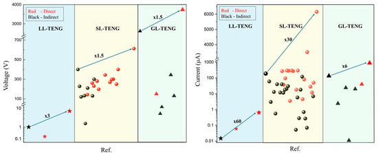 Figure 12 provides a comparative overview of voltage and current outputs between indirect and direct charge transfer mechanisms across various TENG configurations. This review makes a foundational contribution to the field of fluid-based TENGs by proposing the first systematic framework that defines and standardizes the mechanisms of direct versus indirect charge transfer. Unlike previous works that primarily categorized devices by interface type (e.g., SL, LL, or GL), our framework provides a unified classification based on a rigorous analysis of physical principles, device architectures, and quantitative energy conversion results. This work establishes the direct vs. indirect dichotomy as a fundamental, cross-cutting design principle, reframing the field’s understanding of triboelectric performance limits. Furthermore, it delivers practical guidance for optimizing material selection, interface structure, and application-specific system architectures to realize high-efficiency, robust, and scalable energy harvesting devices.