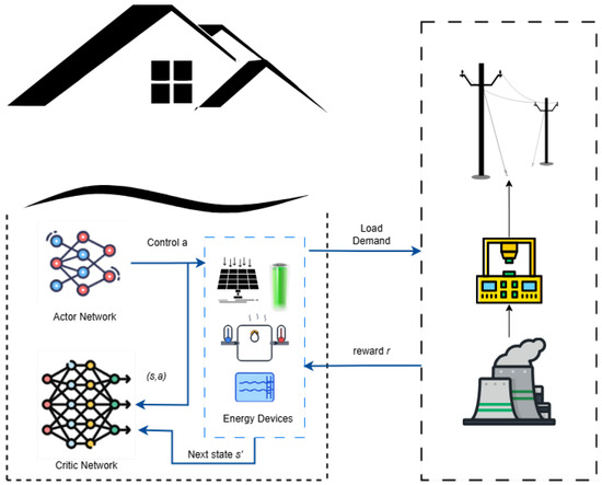 The rest of this paper is structured as follows. Section 2 formally casts the residential demand-response challenge as a Markov decision process, defining the problem’s state, action, and reward components. This section also presents the multi-agent Soft Actor–Critic framework. Section 3 details our methodology, presenting the CityLearn simulation environment, the baseline controllers used for comparison, and the metrics for evaluation, in addition to providing the complete workflow of the problem. Section 4 presents and discusses the empirical results, providing a comparative analysis of the controllers and interpreting the learned behaviors. Finally, Section 5 concludes the paper by summarizing the key findings, acknowledging the study’s limitations, and suggesting avenues for future work.