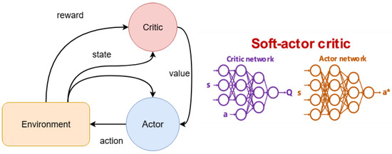 SAC adopts an actor–critic design in which two deep networks approximate the value functions: one evaluates actions, and the other estimates the state value. Figure 2 sketches the main components of SAC and the data flow between them. The paragraphs that follow describe these elements and how they interact during training.