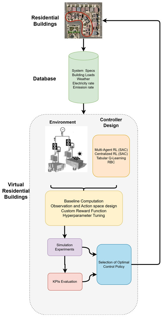 This section describes the experimental framework used to evaluate the proposed multi-agent reinforcement learning controller for residential demand response. We used a case study built from high-resolution measurements in a community of zero-net-energy homes, which serves as the basis for our simulations. To train and test control agents, we instantiated this scenario within the CityLearn environment so that agents interact with a consistent, repeatable representation of the district. The choice of CityLearn is central to the design. As a standardized testbed for residential demand-response studies, it offers a reproducible setting for multi-agent analysis and avoids the considerable computational burden associated with full co-simulation using detailed physics engines such as EnergyPlus. Figure 3 presents a schematic overview of this entire workflow, illustrating the key stages, from data acquisition and setup of the simulation environment to controller design, experimental execution, and final policy evaluation.