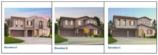 Our assessment framework relies on a dataset drawn from 17 single-family, zero-net-energy households located in the Sierra Crest community in Fontana, California. Different types of residential buildings utilized in the case study are shown in Figure 4. This figure displays the different architectural elevations of the homes in the dataset. These variations in design and size are a primary source of the energy consumption heterogeneity that our decentralized control strategy aims to address. These homes were monitored under the California Solar Initiative, a study that sought to quantify how neighborhoods with high rooftop photovoltaic penetration and on-site battery storage interact with the distribution grid [34].