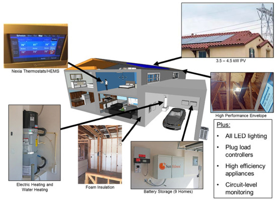 The study sample consists of 17 single-family prototypes with conditioned floor areas spanning 177 to 269 . Figure 5 summaries each home’s envelope and mechanical profile. The envelope employs high-performance insulation and glazing, while the internal systems rely on premium-efficiency appliances, together with fully electric space-conditioning and water-heating equipment, a configuration expected to curb baseline demand. Circuit-level meters capture sub-minute load traces, and an energy management platform permits either manual scheduling or automated control. A total of 8 of the 17 buildings also contain a lithium-ion battery rated at 5 kW, offering 6.4 kWh of nominal capacity given a 90% round-trip efficiency and a 75% depth of discharge.