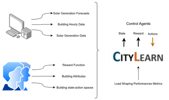 CityLearn provides a reinforcement learning testbed for analyzing demand-response strategies in both single- and multi-agent configurations [36]. The environment inherits the OpenAI Gym interface and follows the multi-agent conventions outlined by Lowe et al. [37]. Because CityLearn relies on pre-computed building loads and internal device models, it eliminates the need for slower co-simulation with EnergyPlus or comparable engines. The main components of CityLearn are shown in Figure 6. The flowchart shows that CityLearn is the testbed for implementing reinforcement learning algorithms, and it provides an environment for building simulation by making use of the data available to this platform through multiple third-party data sources. These inputs configure the central CityLearn environment, which facilitates interaction with the control agents. This interaction follows a standard reinforcement learning loop, in which the environment typically sends the current state and a calculated reward to the agents, who, in turn, process this information and send actions back to the environment to be executed. The goal of this process is to optimize building energy consumption. The effectiveness of the agents’ learned policies is then quantified and output as load-shaping performances metrics, which measure the impact on objectives like peak load reduction and energy cost savings.
