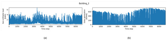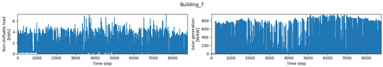 Figure 7 and Figure 8 span one year at hourly resolution and depict the load and solar profile of building 2. The non-shiftable load shows a persistent base between roughly 1 and 4 kWh per hour, with occasional peaks that reach about 6 to 7 kWh. Day-to-day variability is evident, yet the baseline remains relatively stable, indicating that a sizable share of demand is not easily deferred. The PV series follows the expected daily and seasonal pattern. Output drops toward zero at regular intervals that align with night hours, then recovers during daylight. The annual envelope strengthens through midyear and peaks in late summer, after which it gradually weakens.