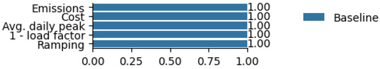 The load factor (L) is defined as the average of the ratio between the monthly mean and the monthly peak of the district hourly load (, where m indexes the months) across months. The quantity of L lies in the range of , so one may maximize L or, equivalently, minimize . This is the last KPI to be measured.