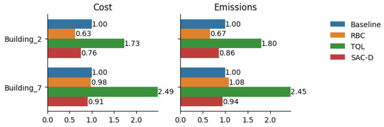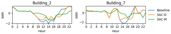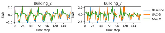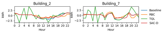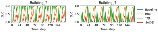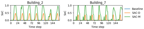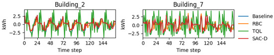 Buildings 2 and 7 are selected at random for simulation purposes, and multi-agent SAC is employed for both of the buildings. The reason for the selection of two buildings is the fact that it takes considerable time for each agent to train for a whole year. Therefore, as a proof of concept, only two random buildings are selected, and the results can be extended to any number of buildings, given that the necessary compute is available.