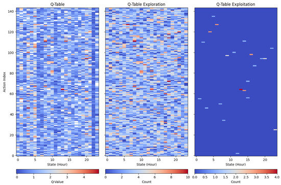 Figure 21 shows the pattern of battery charging and discharging. The reason that TQL performs the worst is evident from this chart, as the charging and discharging of batteries are not learned properly and the actions are random at best. Figure 22 shows all the possible values of the Q-table, which shows that there is not enough exploitation of optimal control actions and that the fails to find reasonable patterns. This could be due to limited training episodes as well. The rule-based controller charges and discharges the batteries during the first and second half of the day, respectively, and, hence, achieves better performance than all other implemented controllers.