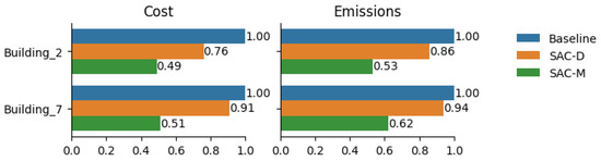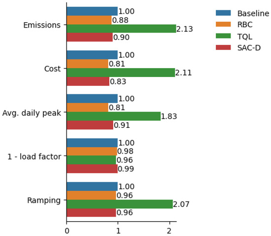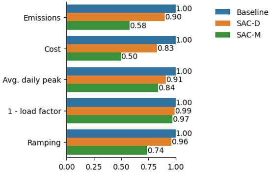 The SoC for both buildings (Figure 27) indicates that batteries are charged fully and more or less follows the trend of the RBC-based controller but in a more optimized way. The plot shows that the agents learned a consistent and effective policy: they systematically charge the batteries to near-maximum capacity during the mid-day hours, a period that corresponds perfectly with peak solar generation. This action demonstrates that the agents successfully learned to harvest and store available renewable energy. Subsequently, the traces show a complete discharge of the batteries during the evening hours, specifically between 4 p.m. and 9 p.m., which aligns with the period of highest grid demand and peak electricity prices. The results are even better than those of the RBC-based controller, without the need for manual labor to set the rules for charging and discharging. As depicted in Figure 28, District-level KPIs are also improved significantly in the case of emissions, cost, daily peak, and ramping, where a minimum of 15% and maximum of 50% reduction is achieved. The only KPI that does not improve significantly is the load factor, but its value is still better than all of the controllers. Hence, it is evident that SAC in a decentralized configuration significantly outperforms the battery controller in a centralized configuration. The reason behind decentralized SAC outperforming the centralized configuration is the fact that each controller is now able to independently charge and discharge the battery; thus, the policy for each building is optimal to its locality. By absorbing the mid-day solar surplus and dispatching it to cover the evening load, the batteries act as intelligent energy buffers, effectively shielding the grid from the buildings’ peak demand. This learned behavior is also more pronounced than the static schedule of the RBC. It is an adaptive policy that can adjust to daily variations in weather and load, which is why it not only matches but significantly surpasses the strong RBC benchmark. This in-depth analysis confirms that the success of the multi-agent framework is not superficial but is the direct result of independent agents learning an effective, interpretable, and locally tuned control strategy to achieve significant system-wide benefits.