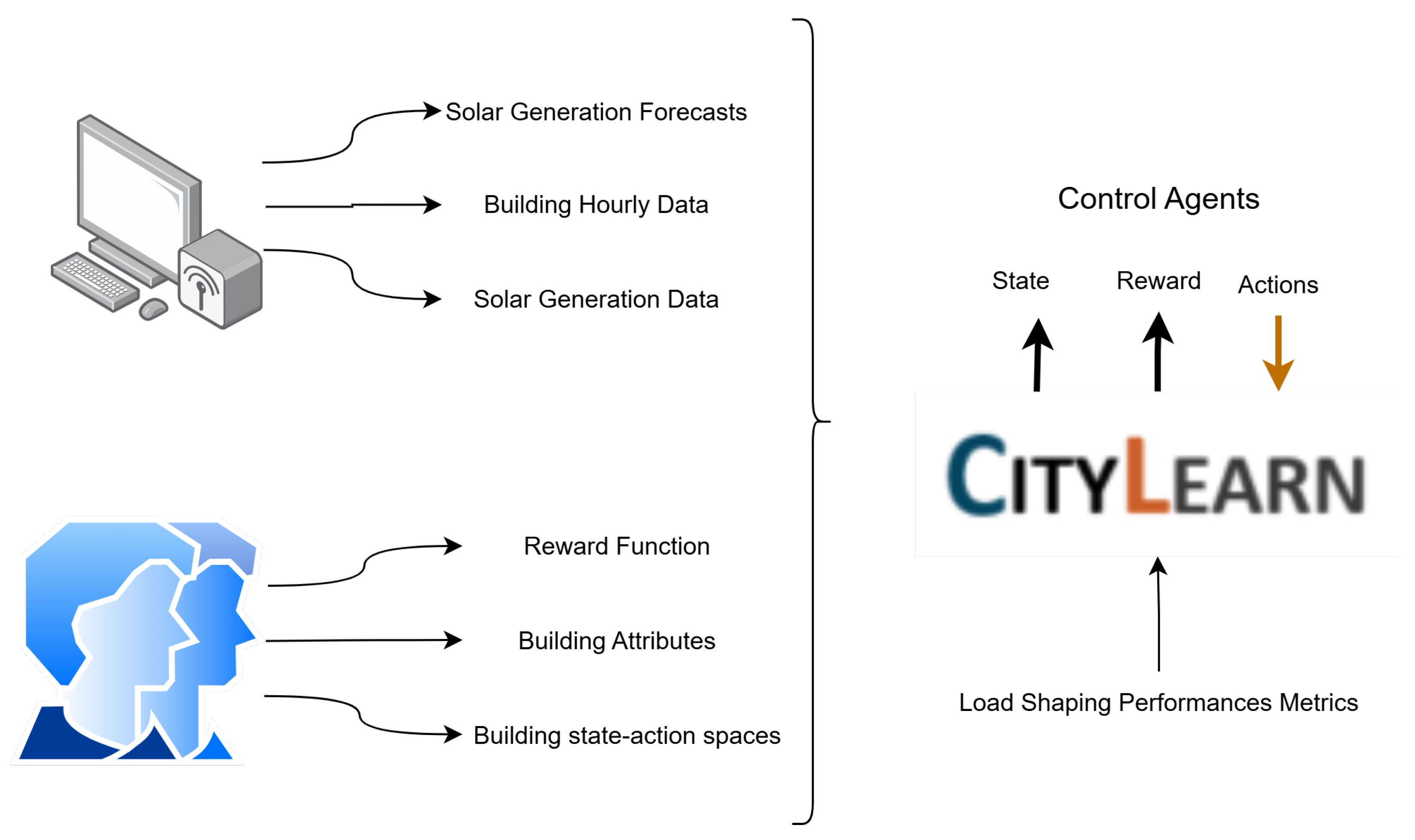 14)). Likewise, we want to reduce the peaks and ramping and increase the load factor. One way to achieve this is to teach the agents to charge the batteries when electricity is cheap after 9 p.m. and before 4 p.m., which typically coincides with when the grid is cleaner (lower emissions). But as stated earlier, each building is able to generate power, provided there is solar power. Therefore, we can take advantage of self-generation in the late morning to late afternoon to charge for free and discharge the rest of the day, thereby reducing electricity cost and emissions at the very least. Also, by shifting the early-morning and evening peak loads to the batteries, we can improve on our peak and load-factor KPIs.