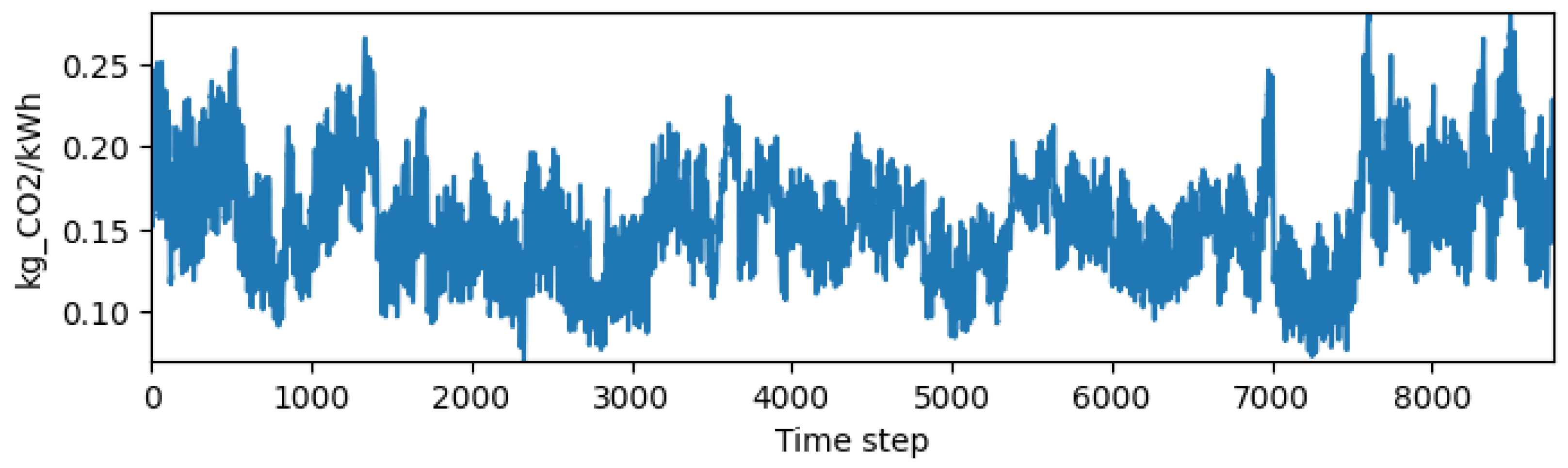The carbon-intensity trace fluctuates between about 0.10 and 0.26 kg  per kWh over the year. Several multi-day windows of comparatively low intensity appear in mid to late year, while higher plateaus are more common at the beginning and near the end of the record. The lack of a perfect alignment with PV availability is notable. Periods of abundant solar coincide with lower-than-average intensity only part of the time, which implies that carbon-aware control cannot rely on solar output alone.