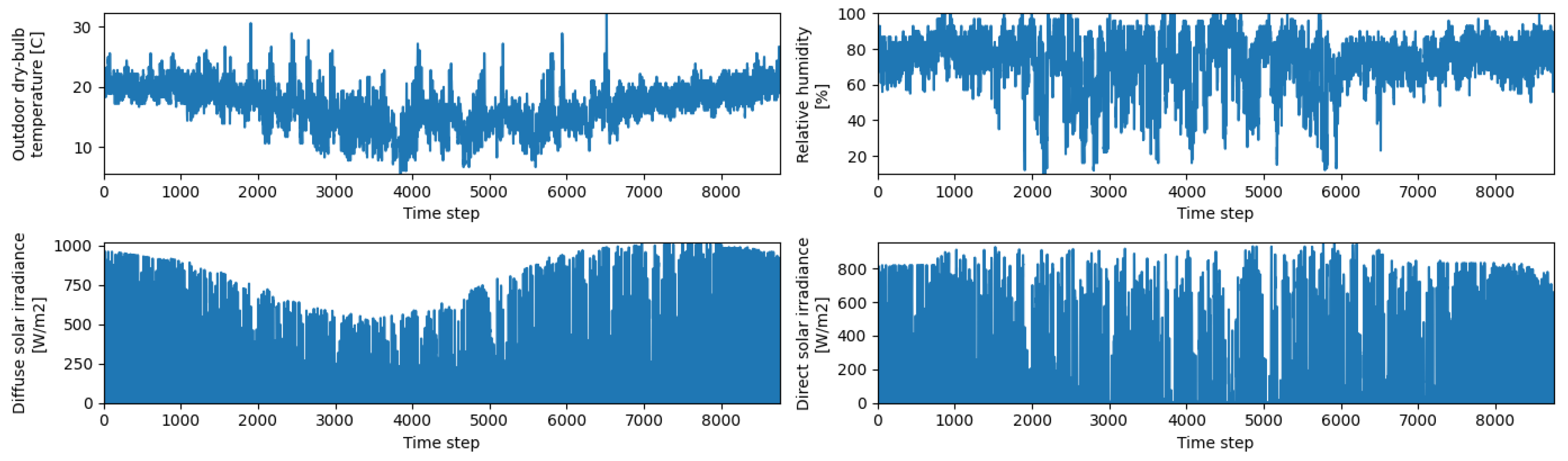 Figure 11. The outdoor dry-bulb temperature is mostly between 15 and 25 °C, with a broad cool period near the middle of the series at around 8–10 °C, then a gradual return to warmer conditions toward the end. Relative humidity is generally elevated, often between 60 and 90%, with sharper drops during the drier season. Solar inputs follow a clear seasonal envelope. Direct irradiance weakens during the shorter days of winter and strengthens into a long summer plateau, while diffuse irradiance shows a complementary pattern with higher values during cloudier or lower-sun periods. The frequent short dips in both series likely reflect transient cloud cover or brief sensor clipping rather than sustained regime shifts.