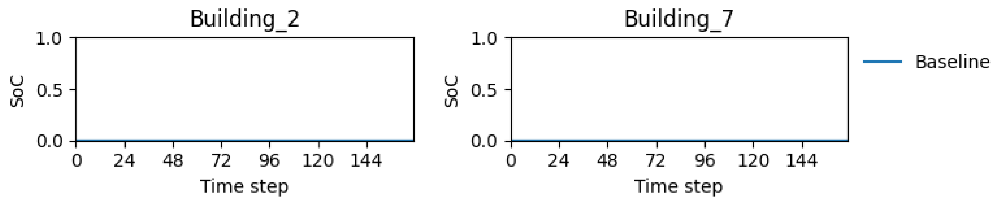 Figure 27, which show the batteries for the two buildings charging and discharging in near-perfect unison, driven not by communication but by a shared, external economic driver. There are, however, certain limitations. The analysis was conducted on two buildings as a foundational proof of concept, which allows for a deep, behavioral interpretation of the learned policies but does not constitute a comprehensive verification of the framework’s performance at a larger scale. Extending the system to a larger and more diverse fleet of buildings introduces several critical challenges that must be addressed in future work. While our decentralized framework is designed to minimize direct communication overhead by relying on broadcast environmental signals rather than peer-to-peer messaging, the infrastructure required to deliver these signals reliably to hundreds or thousands of agents would need careful design to avoid latency issues. More critically, there is a potential for inter-agent strategy conflicts that can arise from the collective impact of agents on the physical grid. In our current simulation, the grid is treated as an infinite bus, meaning one agent’s actions do not affect the environment another agent observes. However, in a real distribution network, the simultaneous discharge of dozens of batteries could cause local voltage swells or other instabilities. This introduces a form of non-stationarity into the environment, where the agents’ collective actions change the rules of the game. A large-scale deployment would require co-simulation with a power distribution network model to study and mitigate these effects. A further limitation is the policy’s static nature relative to the tariff structure. The agents’ learned policies are highly optimized for the economic conditions present during training and cannot dynamically adapt to significant changes, such as a utility altering the time-of-use (TOU) price gap. In such a scenario, the learned strategy would become sub-optimal, and the agents would require retraining on the new data. This highlights an important avenue for future research into online learning methods that would enable agents to continuously adapt to evolving pricing schemes. The underperformance of Q-learning may reflect the discrete formulation and limited training horizon rather than a fundamental ceiling of value-based methods. Finally, CityLearn relies on precomputed loads and internal device models, so co-simulation with full physics engines could reveal interactions not captured here. There are several avenues for future research as well. As mentioned above, the analysis was conducted on two buildings as a proof of concept. Future work should investigate the scalability and performance of the framework across a larger and more diverse fleet of buildings, incorporating potential network constraints. A key limitation of this study is that it evaluates the controller’s performance on a holistic, aggregate basis over a full year. While the year-long simulation data naturally contains a wide variety of events, including days with significant PV generation fluctuations due to weather, we did not perform a fine-grained analysis of the agent’s behavior during such specific, off-normal conditions. Similarly, we did not explicitly model a “grid emergency” event to test the system’s response to an extreme, short-notice demand-response signal. The analysis of such critical events is a crucial avenue for future research. Further refinement of the reward function could also be explored to target additional grid services or to more explicitly balance competing objectives. Finally, validating the proposed controller within a co-simulation environment that integrates detailed building physics models would further strengthen the findings by capturing more complex thermal and electrical dynamics.