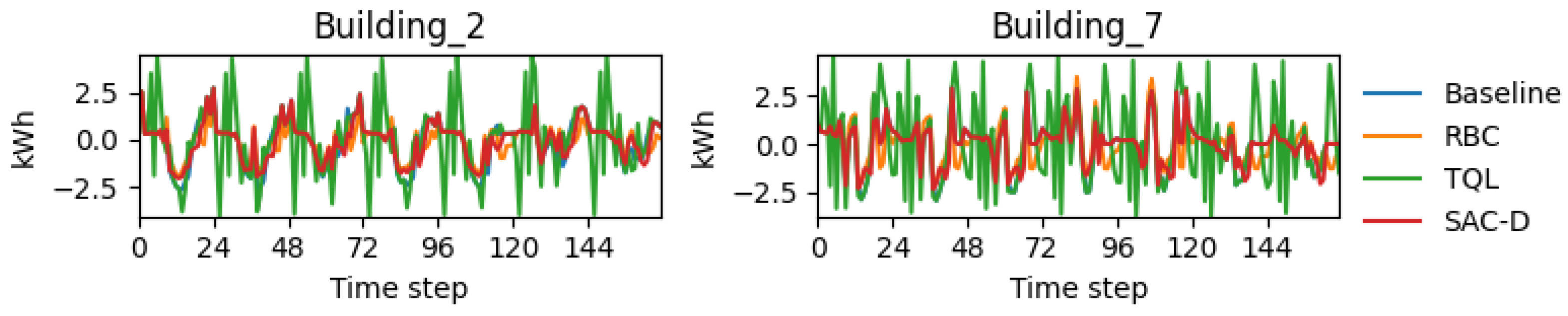 The superior performance of the multi-agent SAC framework is therefore the central finding of this work, and its success is rooted in its direct confrontation of the issue of heterogeneity. By assigning an independent agent to each building, the system allows for the development of specialized, locally optimal control policies. We can infer that the agent for Building 7, with its higher and steadier load, likely learned a more aggressive discharge strategy for the evening peak, while the agent for Building 2 may have adopted a more conservative policy to handle its sporadic, high-magnitude spikes. This capacity for tailored adaptation is something a centralized controller simply cannot achieve.