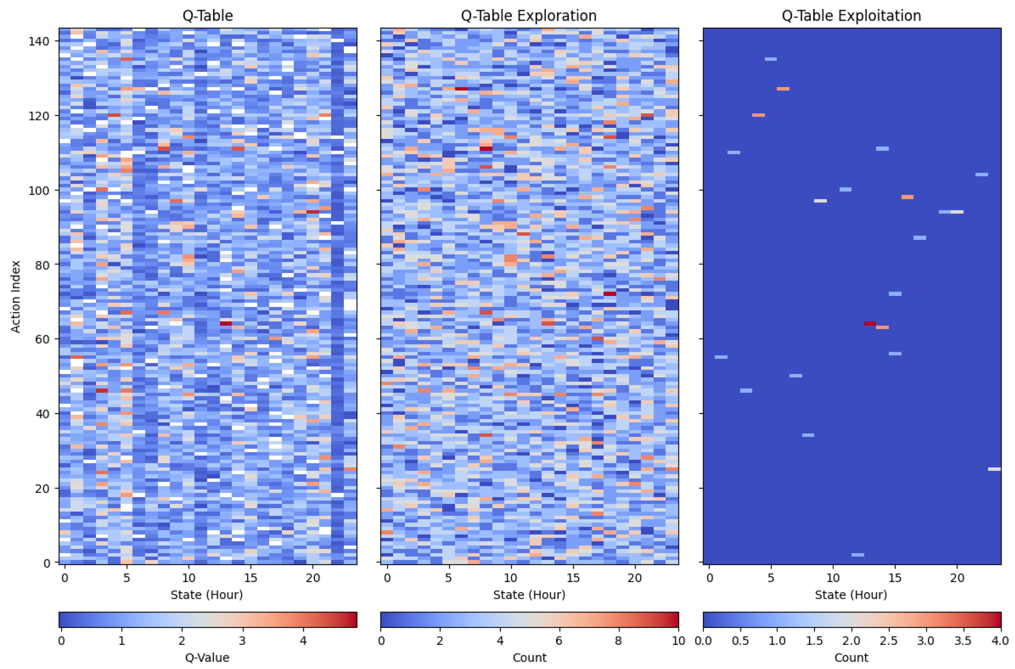 Figure 22 shows all the possible values of the Q-table, which shows that there is not enough exploitation of optimal control actions and that the fails to find reasonable patterns. This could be due to limited training episodes as well. The rule-based controller charges and discharges the batteries during the first and second half of the day, respectively, and, hence, achieves better performance than all other implemented controllers.