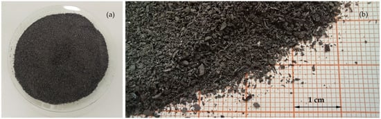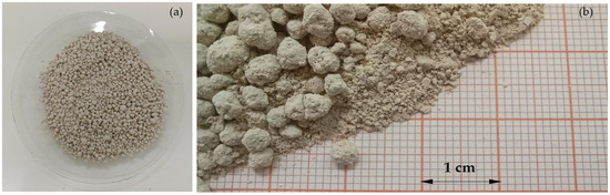 The CAL used in the experiment was purchased at Wap-Pol Trade, Service and Transport Company (WAP-POL, Radoszewice, Poland). The highly reactive, granulated calcium fertilizer (Figure 3a) contains 55% CaO, with a granule size of 3–6 mm representing at least 90% by weight, according to ISO 3310-1:2016 [40] (Figure 3b).
