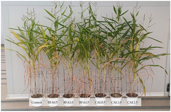 Effect of increasing neutralization of soil acidity with BFA and CAL on the appearance of corn plants (Zea mays L.). Control—without neutralizing material; BFA0.5 (16 g of BFA pot−1 equal to 0.5 Hh); BFA1.0 (32 g of BFA pot−1 equal to 1.0 Hh); BFA1.5 (48 g of BFA pot−1 equal to 1.5 Hh); CAL0.5 (7 g of CAL pot−1 equal to 0.5 Hh); CAL1.0 (14 g of CAL pot−1 equal to 1.0 Hh); CAL1.5 (21 g of CAL pot−1 equal to 1.5 Hh).
