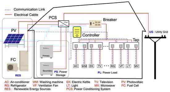 Smart home systems have evolved significantly with advancements in the Internet, transforming traditional homes into interconnected spaces where appliances and devices communicate seamlessly []. Modern smart homes often incorporate RESs like PVs and Fuel Cells (FCs) alongside conventional appliances, creating more sustainable and efficient energy ecosystems []. Through integration with RESs, smart home systems can optimize energy usage, reduce dependence on fossil fuels, and minimize environmental impact. As these systems continue to evolve, they promise to revolutionize modern living by providing personalized, interconnected, and energy-efficient environments. These systems gather energy profiles and oversee automation controls, managing the ON/OFF operations of Home Appliances and Devices (HADs) efficiently [].