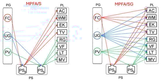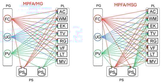 We examine four power-flow assignment scenarios in Table 2 that differ in how power generators (PGs), power storage systems (PSs), and power loads (PLs) are interconnected. (1) MPFA/S (multi-load, single storage): multiple PLs are supplied via a single PS; a single RES-based PG (optionally backed by the UG) charges that PS (Figure 2). (2) MPFA/SG (multi-load, single generator): multiple PLs are connected to a single RES PG and a single PS (Figure 2). (3) MPFA/MG (multi-load, multiple generators): multiple PLs are supplied by multiple RES PGs and a single PS (Figure 3). (4) MPFA/MSG (multi-load, multiple generators and storages): multiple PL sets can draw from all RES PGs, the UG, and multiple PSs (Figure 3).