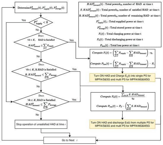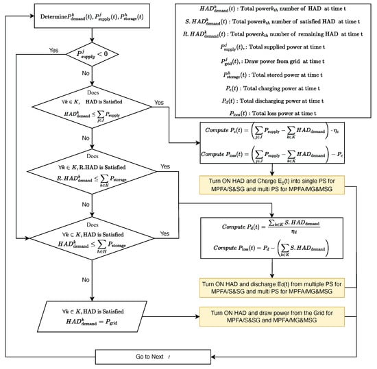 The Total-Demand-Based Power Flow (TDPF) algorithm is depicted in Figure 4 and constitutes a baseline approach to power management in the DPFS. This algorithm operates by first evaluating the total power demand of the system at each discrete time interval and comparing it to the sum of the available power supply from Power Generation (PGs) and Power Storage Systems (PSs).