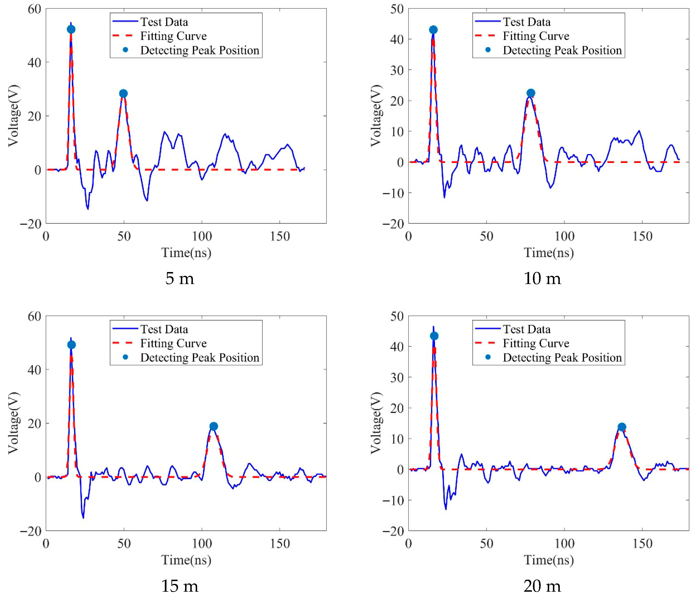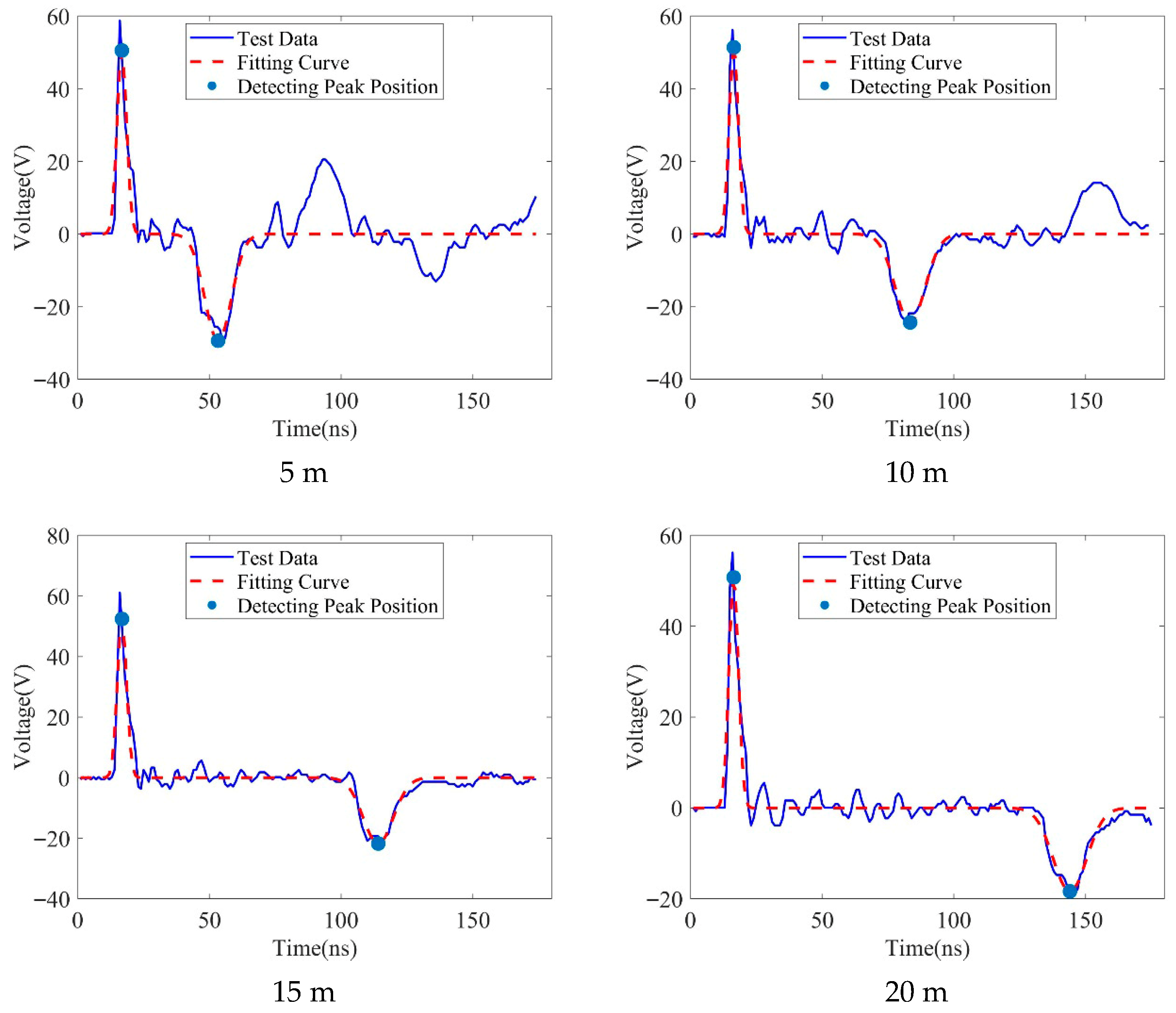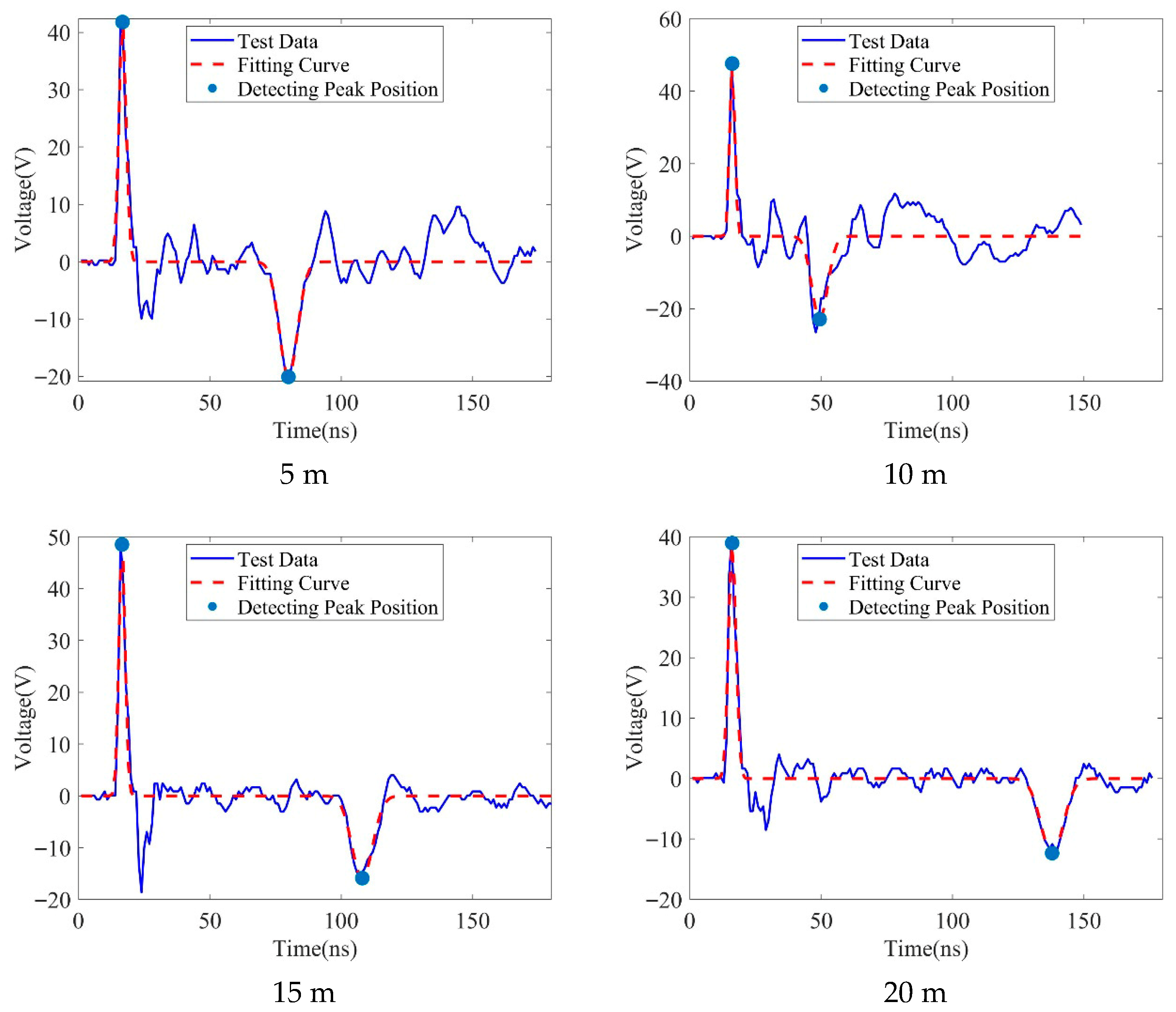 Figure 8. This demonstrates that the double-Gaussian model optimization effectively filters transient noise while preserving the linear core amidst fluctuations. The minor variations in the figure reflect not methodological shortcomings but authentic responses of the complex cable system—inherent disturbances like joint impedance jumps and electromagnetic coupling are accommodated within the error band by the dual-peak identification process. This capacity to fit imperfect data constitutes the method’s core advantage over traditional peak detection: it prioritizes trend consistency over absolute single-point accuracy, thereby ensuring localization reliability.