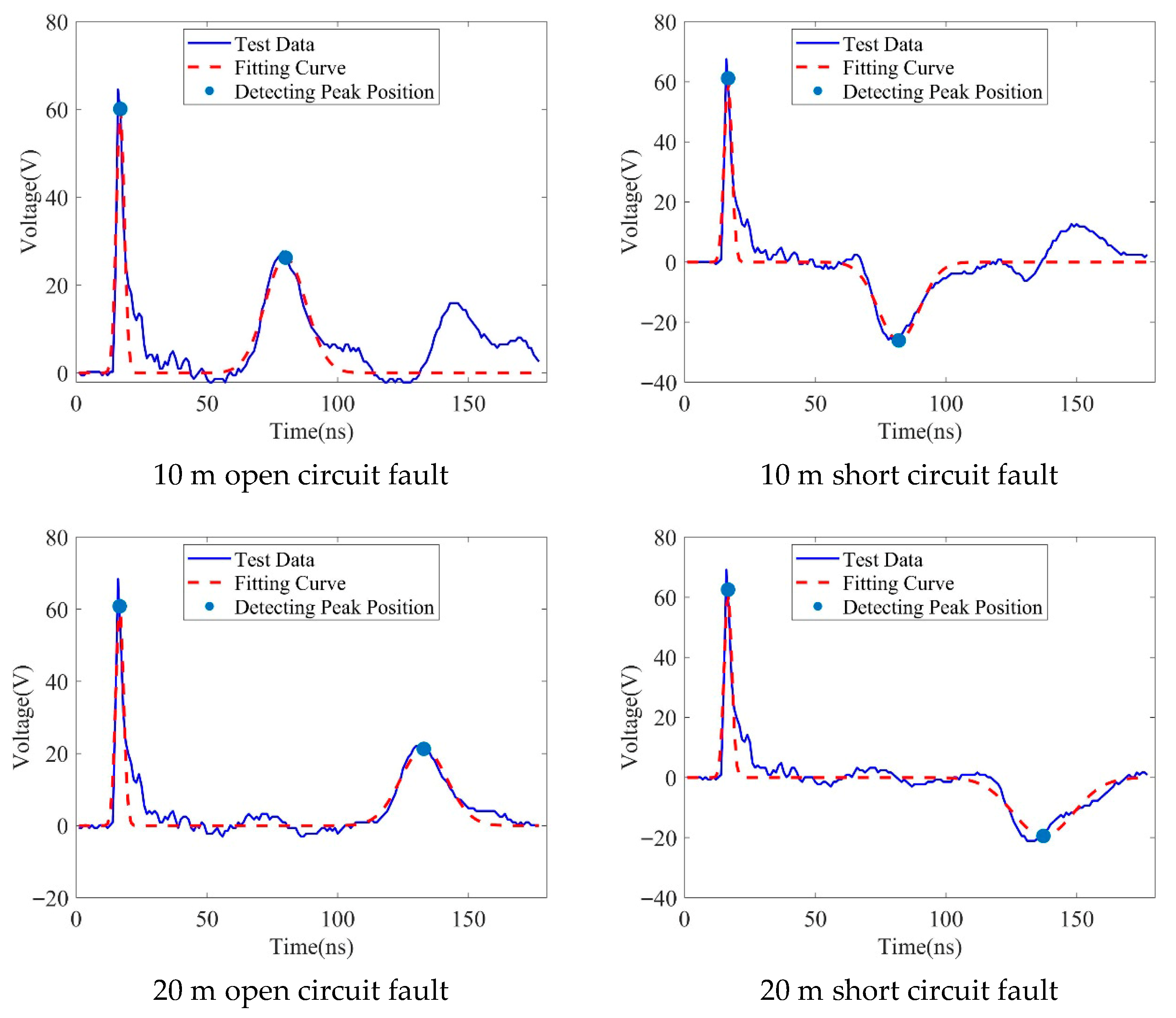 v accounts for the bulk propagation in the cable, these localized effects at the fault point itself could result in a consistently longer measured round-trip time for short-circuit conditions. The magnitude of this delay difference is small and systematic, which further supports its origin in the fundamental physics of the reflection process rather than being random measurement noise.