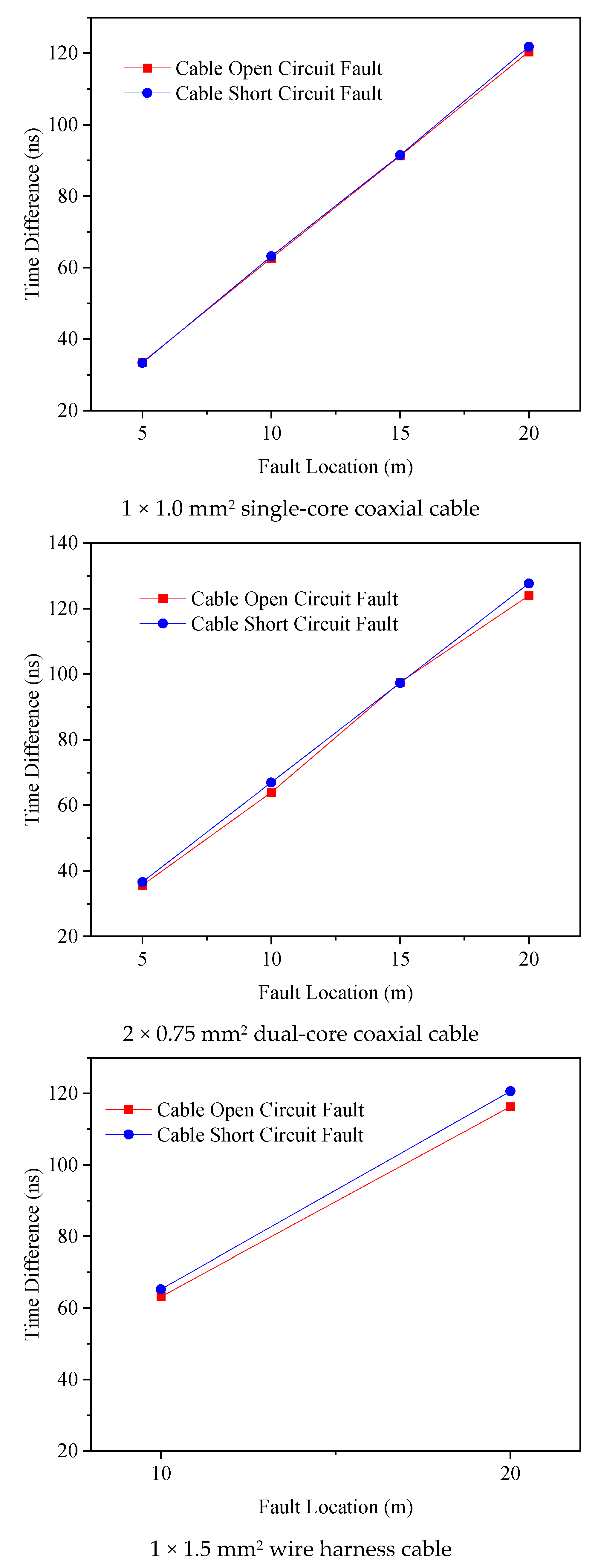 Figure 8 demonstrate the core relationship between fault distance and time delay: despite minor deviations between open- and short-circuit measurements (e.g., 63.92 ns for open vs. 66.98 ns for short at 10 m in dual-core coaxial cable, a discrepancy of 3.06 ns), the values strictly adhere to a linear growth trend. This relationship remains robust across cable types and fault scenarios—when fault distance increases from 10 m to 20 m, the time difference rises from 62.61 ns to 120.42 ns (92.3% increase) for single-core coaxial open-circuit faults, and from 65.29 ns to 120.63 ns (84.8% increase) for wire harness short-circuit faults. The slopes of the observed linear relationships closely match the theoretical slope of 2/