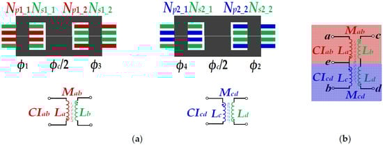 Then, the magnetic columns in Figure 3d can be separated, as shown in Figure 4a. And a magnetic integrated structure consisting of two EE cores can be obtained, which is called DCI structure in this paper. The circuit model of the DCI structure is shown in Figure 4b. Comparing the above structures in terms of magnetic components, volume, and losses, as shown in Table 1, it can be found that the DCI structure not only reduces the number of magnetic components, increases power density, and reduces the total volume of magnetic components, but also reduces the loss of the center column. And compared with the integrated structure shown in Figure 3c, the DCI structure achieves controllable integration of leakage inductance and DC inductance. In addition, the PCB winding structure and two EE magnetic core designs adopted in this scheme have the advantages of easy implementation and large-scale production. And the DCI structure has good scalability and can be extended to other important topologies. In LLC resonant converters, this structure can achieve high integration of the resonant inductor, magnetizing inductor, and transformer, improving power density. In isolated bidirectional converters such as isolated bidirectional buck-boost, this scheme can effectively integrate a transformer and DC inductor, and optimize soft switching characteristics by utilizing their controllable leakage inductance. This indicates that this study not only can optimize a specific converter but also can provide a universal magnetic integration solution for developing the next generation of high-performance power conversion systems.