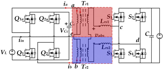 Based on the derived DCI, the topology structure of Figure 1 can be modified to the structure shown in Figure 5, where the red and blue parts represent the DCI structure. For the modified CF-DAB converter, VL represents the wide input voltage range on the low-voltage side, VH represents the output voltage, Tr1 and Tr2 are two identical transformers, ia represents the primary current of transformer Tr1, ib represents the secondary current of transformer Tr2, Lrs1 and Lrs2 represent the internal leakage inductor of the transformer, and L1 and L2 represent the magnetizing inductor of the transformer, whose current is equivalent to the DC current in Figure 1, and VCc represents the clamp voltage of capacitor Cc. In addition, the magnetizing inductor here is equivalent to the DC inductor in Figure 1.