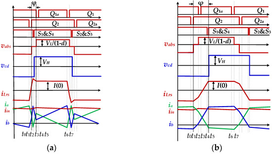 The waveform of this topology under PPS modulation is shown in Figure 6, where PWM is used to maintain the capacitor clamp voltage VCc, d represents the duty cycle of switches Q1 and Q2, and φ represents the phase difference between the rising edges of vabs and vcd. A change in the phase shift angle φ affects the magnitude of the leakage inductor current. According to the division interval of the phase shift angle, it can be divided into two working modes, Mode A(φ ∈ [0, (2d − 1)π]) and Mode B(φ ∈ [(2d − 1)π, π]). The corresponding waveform diagrams are shown in Figure 6a,b, respectively. In addition, the duty cycle of the secondary side switches signal is fixed at 50%, so the midpoint voltage waveform vcd of the secondary side bridge arm is a square wave with a duty cycle of 50%.