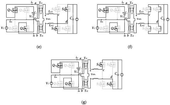 Circuit working intervals in half cycle of the proposed DCI DAB converter [24]. (a) Interval I. (b) Interval II. (c) Interval III. (d) Interval IV. (e) Interval V. (f) Interval VI. (g) Interval VII.