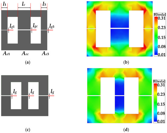 It can be observed that there must be a positive solution for lg, which proves the feasibility of equal air gap design. The coupled inductor structure diagram based on equal air gap design is shown in Figure 10c, and its magnetic simulation is shown in Figure 10d. The calculated cross-sectional area of the middle and outer columns under this design is
