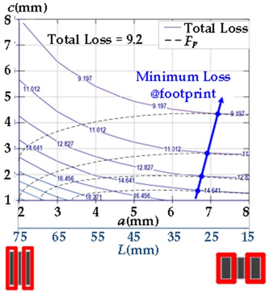 The solid line in the figure represents the waveform of total loss, the dashed line represents Fp at different values of a and c, and the blue tangent point represents the optimal design point, that is, the minimum loss point at a given Fp. It can be found that as Fp increases, the total loss decreases. However, the change in Fp required to reduce the same total loss will increase as the total loss decreases, that is, the degree of decrease in total loss will weaken as Fp continues to increase. Therefore, the final optimization solution is a compromise between Fp and total loss. Based on this, the optimization interval of Fp can be obtained, and the final optimization design point can be selected by combining Figure 13. The final parameter design is determined as a = 6.85 mm, L = 46.5 mm.