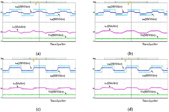 The steady-state waveforms of the proposed DCI CF-DAB under different loads are shown in Figure 15. Figure 15a,b are the waveforms under light load and full load with an input voltage of 18 V, respectively. Figure 15c,d are the waveforms under light load and full load with an input voltage of 36 V, respectively. It can be seen that the converter can achieve stable operation under this design.
