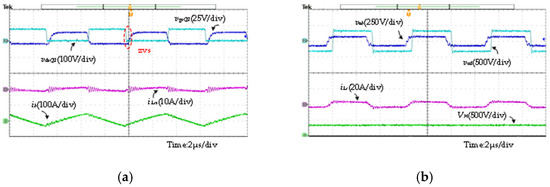 Figure 16a,b show the soft switching waveforms of Q2 and S1 in light load mode when the input voltage is 36 V. It can be seen that this design can achieve ZVS.
