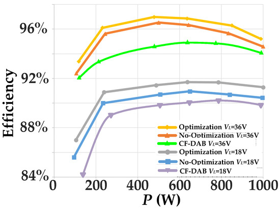 Efficiency comparisons between optimization design, no-optimization design and CF-DAB at different voltages and different loads.