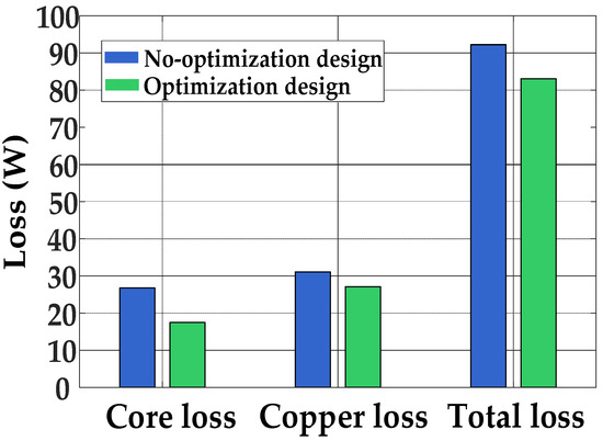 The comparison diagram of losses before and after optimization is shown in Figure 18. Based on this, a loss decomposition table as shown in Table 3 can be obtained. According to the data in Table 3, at VL = 18 V and rated power PN, the proposed optimization scheme has the lowest total loss, which is 9.1% lower than before optimization. This advantage mainly stems from the effective optimization of its magnetic core loss. The magnetic core loss of this optimization scheme is much lower than before optimization. Meanwhile, the optimized winding reduces copper loss, reflecting the rationality of its winding layout and the effectiveness of winding width. In summary, the equal air gap optimization scheme using the DCI structure is feasible and effective.