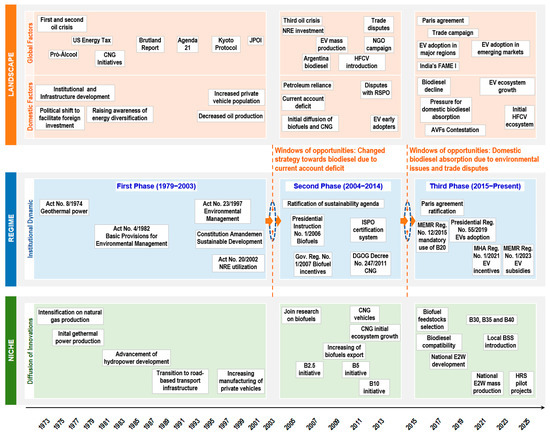 Transportation is an energy-intensive sector in emerging economies, including Indonesia. Niche innovations and landscape dynamics have shaped the institutional dynamics of the energy transition. The evolution of the energy regime has gone through several policies and institutional changes, which are divided into three phases, as follows: