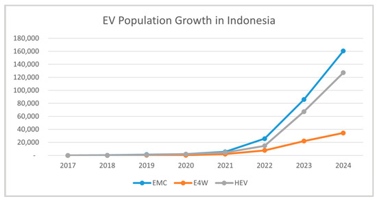 Key policies include Presidential Regulation No. 55/2019, which introduced BEVs [91] and several fiscal incentives, such as tax reductions (Ministry of Home Affairs Regulation No. 1/2021) and title transfer fee exemptions (Government Regulation No. 74/2021). However, significant growth in EV adoption began following the introduction of limited subsidies under Minister of Industry (MoI) Regulation No. 6/2023 [91]. The government has started to provide regulatory support for the adoption of FCVs as potential future AVFs through Minister of Industry Regulation No. 29 of 2023 and the National Hydrogen and Ammonia Roadmap (RHAN) [92].