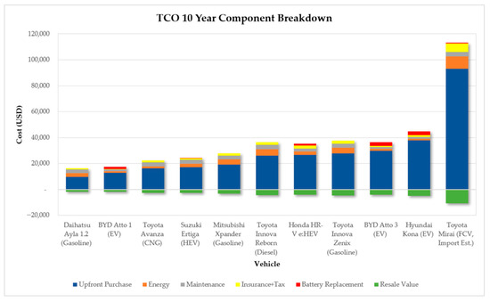 This study examines the TCO to outline vehicle ownership costs across various technologies. The TCO comprises the purchase price, operational costs, maintenance, taxes, insurance, and resale value. It is vital for comparing ICEVs, HEVs, BEVs, and FCVs in consumer decisions and sustainable policies. Previous research shows that the TCO better reflects the competitiveness of new technologies, such as EVs, and is influenced by battery price declines, usage patterns, and energy price variations [53,54,55].