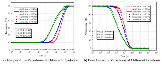 To ensure the accuracy and reliability of the numerical model, model validation is first conducted before carrying out systematic parameter studies. A 2D model with dimensions of 1 m × 0.4 m is constructed. The initial temperature of the model is set to 10 °C, and the initial pore pressure is set to 1 × 105 Pa. The temperature of the upper boundary of the model is set to 60 °C, the pore pressure of the upper boundary is set to 0, and a uniform load of 100 kPa is applied. The other boundaries are considered impermeable and thermally insulated, with normal displacement constrained. The main parameters of the model are listed in Table 1.