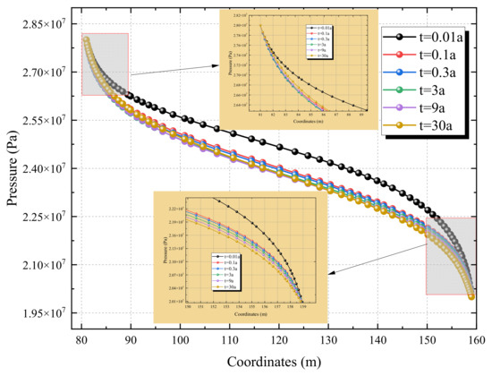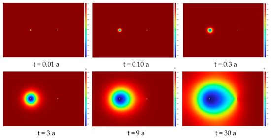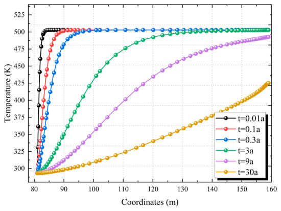 In the early extraction stage (t = 0.01~0.3 a): At t = 0.01 a, only the temperature near the injection well (80~83 m) drops rapidly to around 300 K, while the area beyond 90 m still maintains the initial high temperature of the reservoir; at t = 0.3 a, the cold zone has advanced to 100 m, the temperature in the 80~100 m interval decreases significantly, and the area beyond 100 m remains a high-temperature zone. During this stage, the cold water advances at the fastest speed, which reflects the strong fluid seepage and thermal convection driven by the injection–production pressure difference in the early extraction stage.