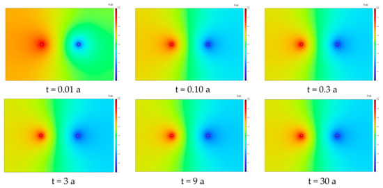 Based on the simulation scheme designed in Section 3, this section selects a typical working condition (well spacing: 80 m, injection–production pressure difference: 8 MPa, injection temperature: 20 °C, initial reservoir temperature: 230 °C) to simulate the 30-year thermal extraction process. Focusing on the simulation results of this benchmark parameter combination, this section systematically analyzes the attenuation law of the reservoir temperature field, the migration characteristics of high-temperature regions, and the evolution trend of the distribution gradient of the pore pressure field with the progress of extraction. It also reveals the multi-field coupling coordinated evolution mechanism of the geothermal reservoir, laying a foundation for subsequent parameter sensitivity analysis.