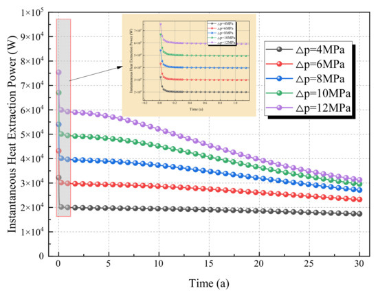As can be seen from Figure 9 and Figure 10, the instantaneous power under all pressure differences continuously attenuates, yet the power under high pressure differences remains consistently higher than that under low pressure differences. For instance, after 30 years, the power under Δp = 12 MPa is approximately 3 × 104 W, while it is only about 1.5 × 104 W under Δp = 4 MPa. This indicates that the “short-term heat production advantage” of high pressure differences can be maintained over the long term, but the attenuation rate is faster; low pressure differences result in lower heat production intensity but better stability.