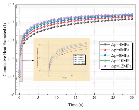 The cumulative heat extraction continuously increases over time and gradually approaches saturation. The cumulative amount under high pressure differences (10 MPa, 12 MPa) is eventually significantly higher than that under low pressure differences (4 MPa, 6 MPa). For example, after 30 years, the cumulative heat extraction under Δp = 12 MPa is close to 2.9 × 1013 J, while it is approximately 1.6 × 1013 J under Δp = 4 MPa.