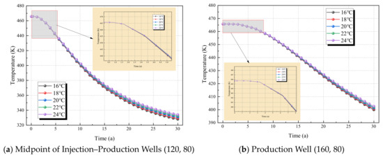 To further quantify the dynamic regulatory effect of injection temperature on the geothermal reservoir temperature field, the midpoint of the injection–production wells (120, 80) and the production well (160, 80) are selected as key monitoring points: the former reflects the average heat exchange status of the area between the injection and production wells, while the latter directly embodies the temperature response characteristics of the heat extraction terminal. Based on the THM coupled simulation results under different injection temperatures (16 °C, 18 °C, 20 °C, 22 °C, 24 °C), temperature time-series data of the two monitoring points are extracted, and the influence law of injection temperature on the temperature evolution at key locations is intuitively presented through line charts.