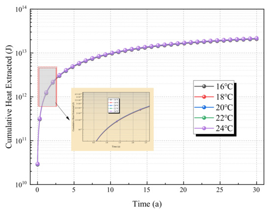 Within the normal temperature range of 16–24 °C, due to the sufficiently large temperature difference with the high reservoir temperature, the regulatory effect of injection temperature on heat extraction efficiency (cumulative heat extraction, instantaneous power) is extremely insignificant, as reflected by overlapping curves. This means that in practical engineering, if the injection water is at normal temperature (e.g., groundwater, surface water), there is no need to overemphasize its minor temperature fluctuations; the optimization of heat extraction efficiency should focus more on core parameters such as injection–production pressure difference and well spacing. The “insensitivity” of injection temperature within this range also provides flexibility in the selection of injection water for geothermal projects—as long as normal temperature conditions are met, stable heat extraction effects can be achieved.